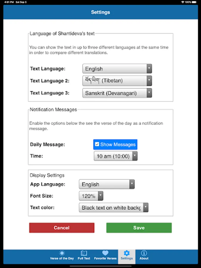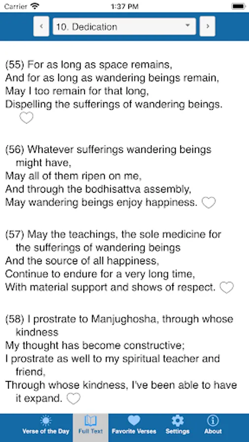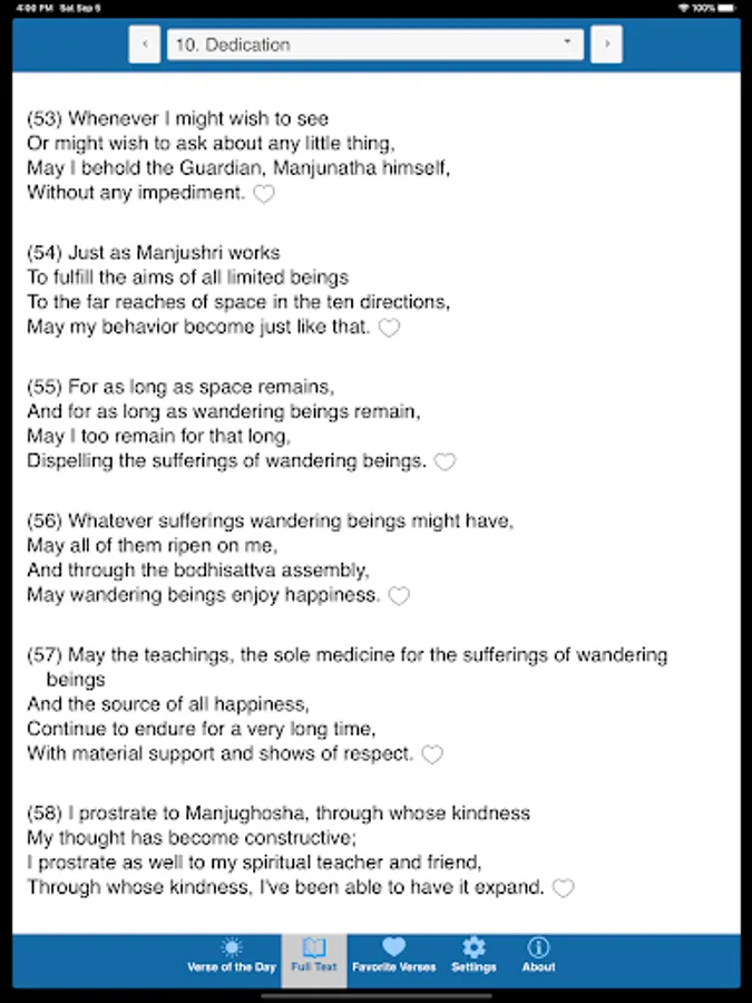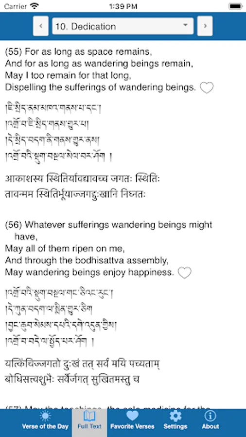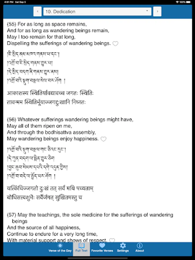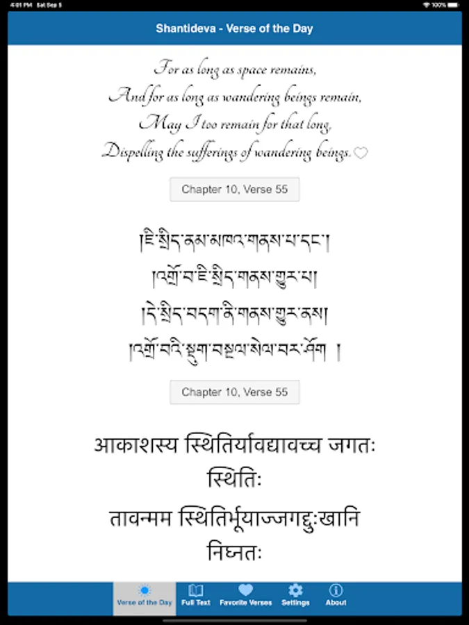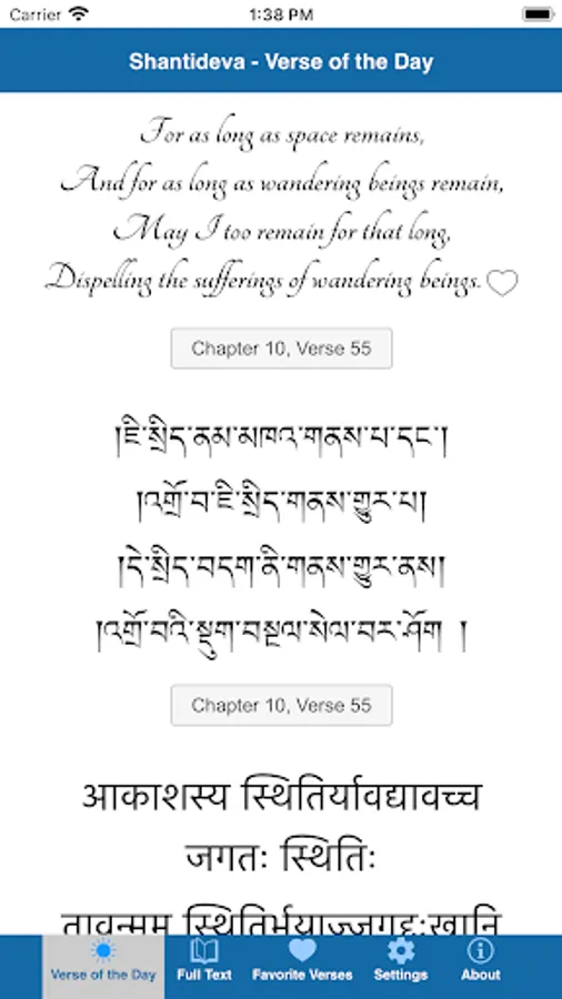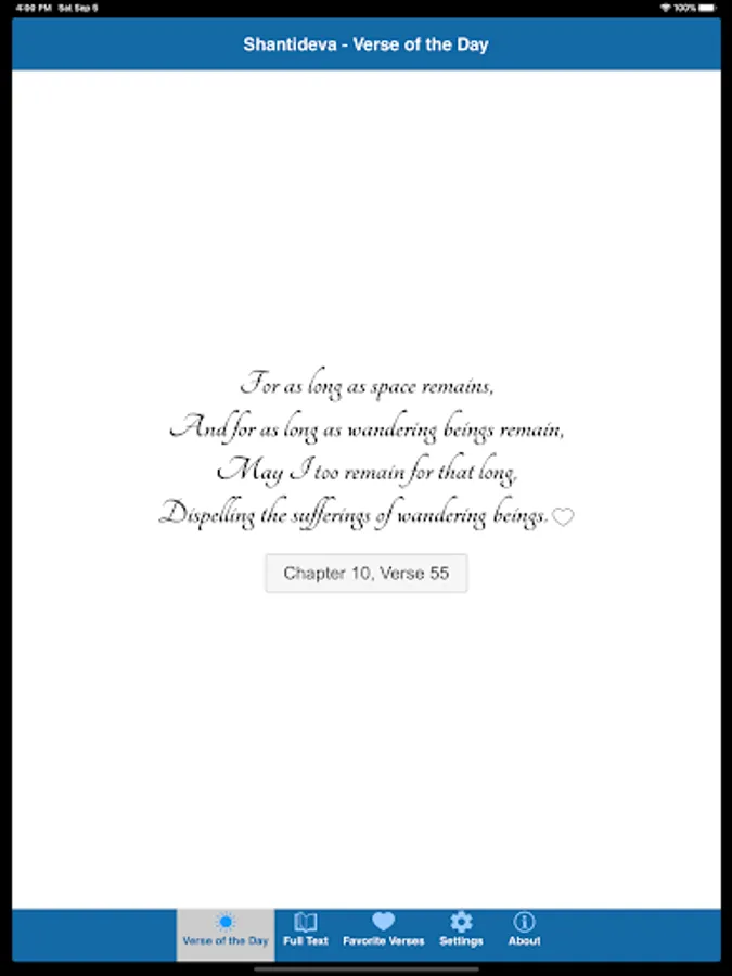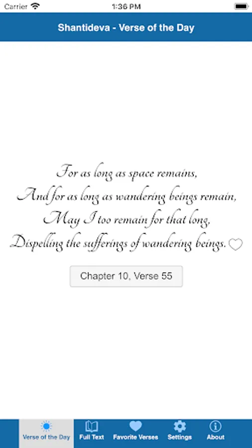 This App displays one verse a day from Shantideva's text "Engaging in Bodhisattva Behavior" (Bodhisattvacharyavatara) and allows to read through the entire text. "Engaging in Bodhisattva Behavior" is an outstandingly practical and inspiring Buddhist text that covers all the aspects of the Buddhist path. Shantideva was a great Indian Buddhist master who lived during the 8th century CE.