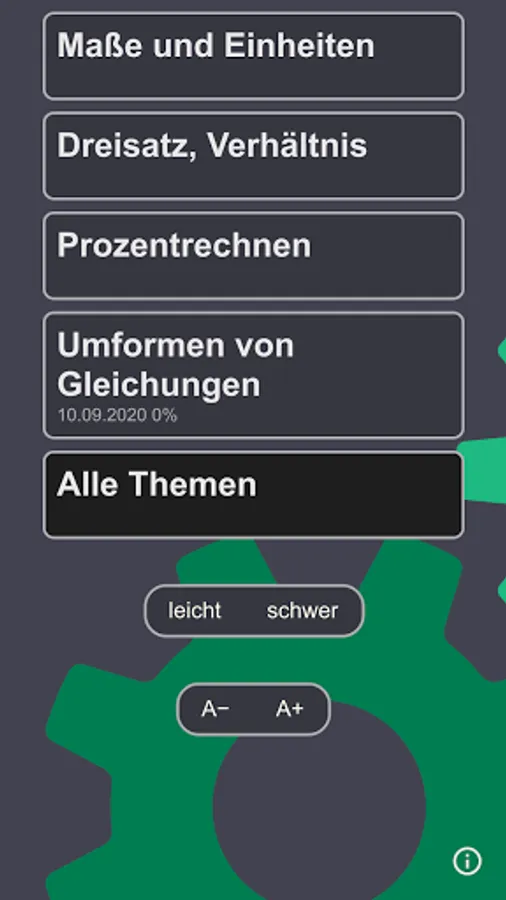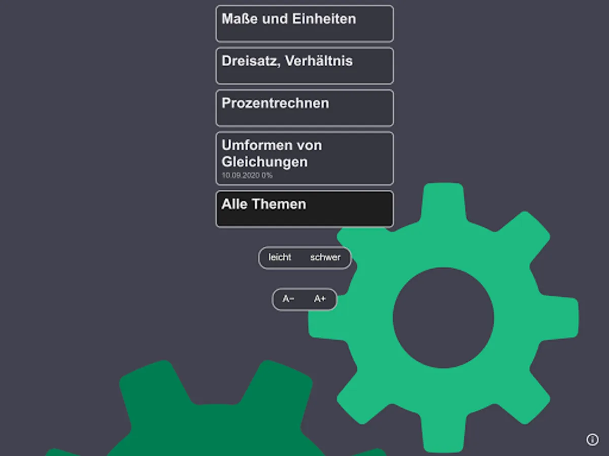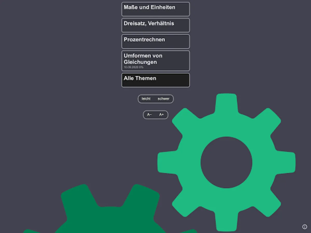 The topics can be practiced as a whole or individually. The start page then shows you how many tasks you have answered correctly so far and when you last practiced the topic. You can also specify whether you should only see easy or difficult tasks.