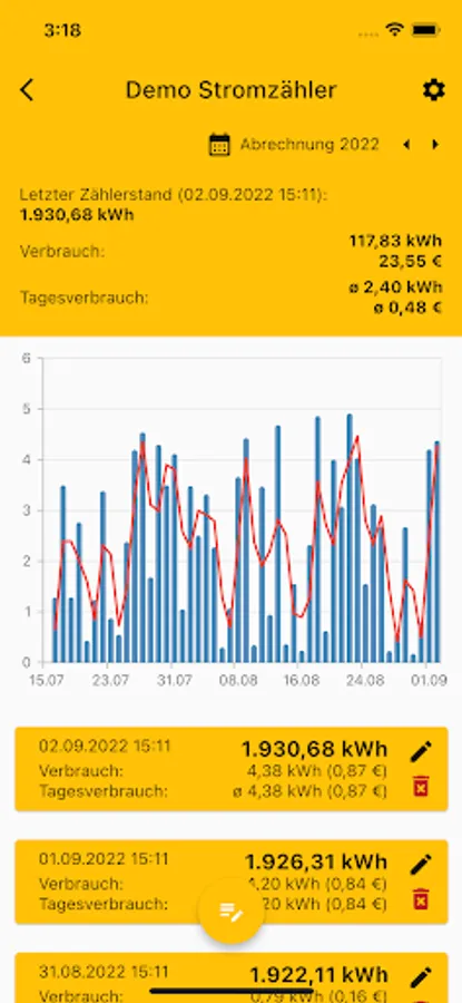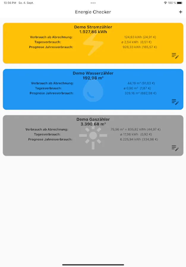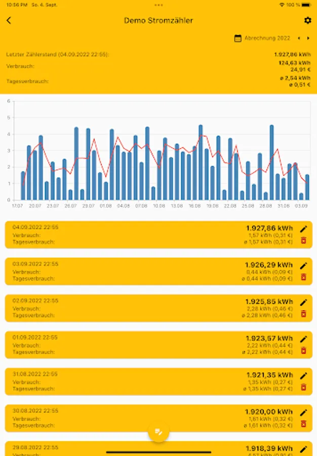 Easily record, manage and evaluate meter readings with Energy Checker. Documenting your consumption of electricity, water, gas, heat or the yield of your solar system is child's play.