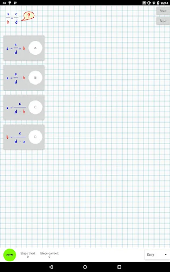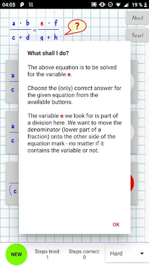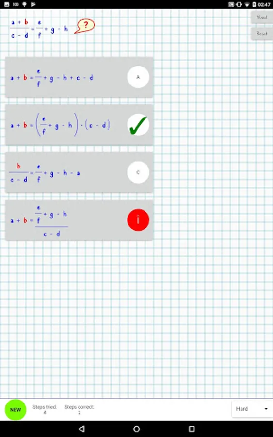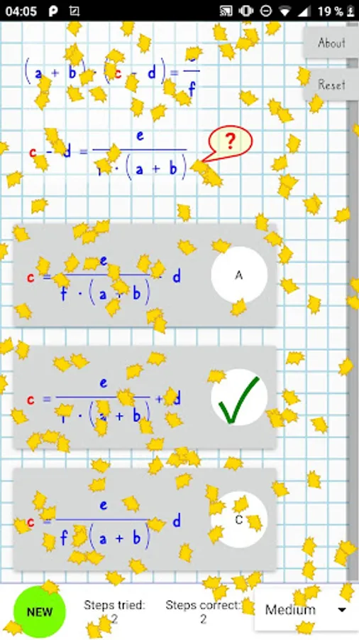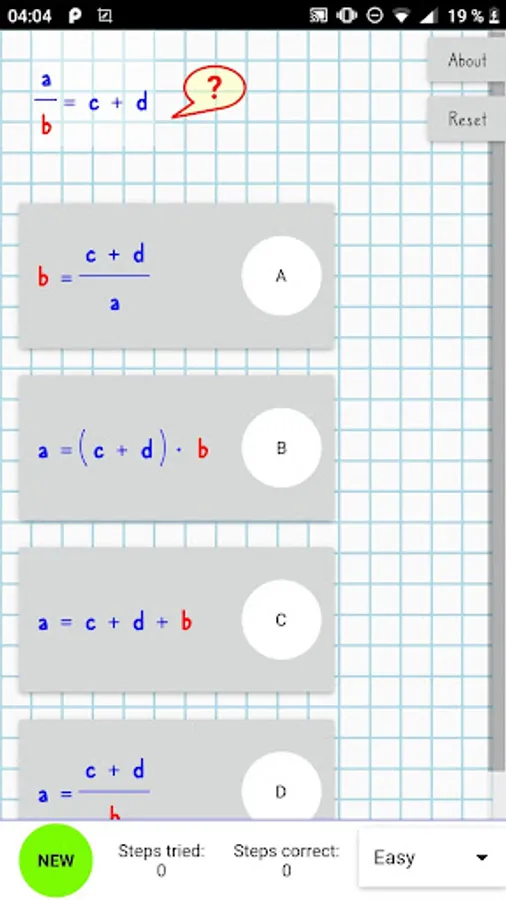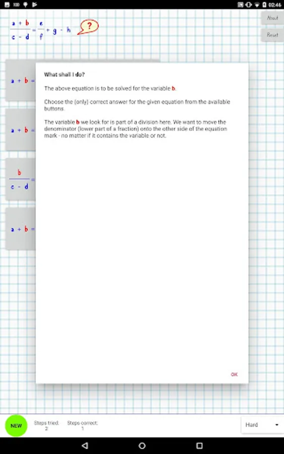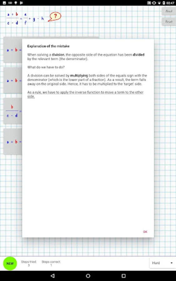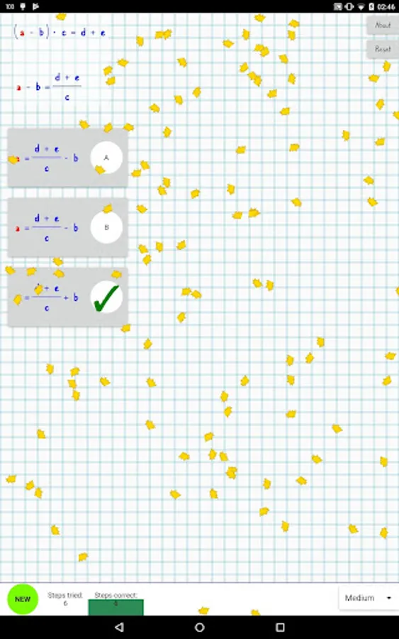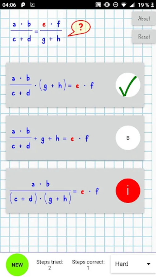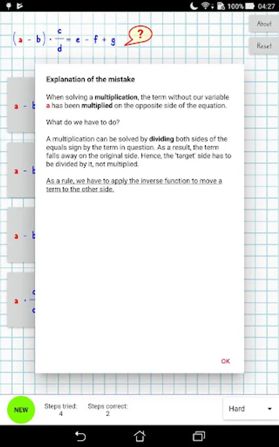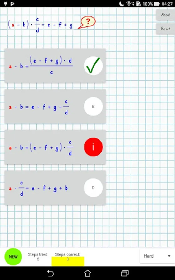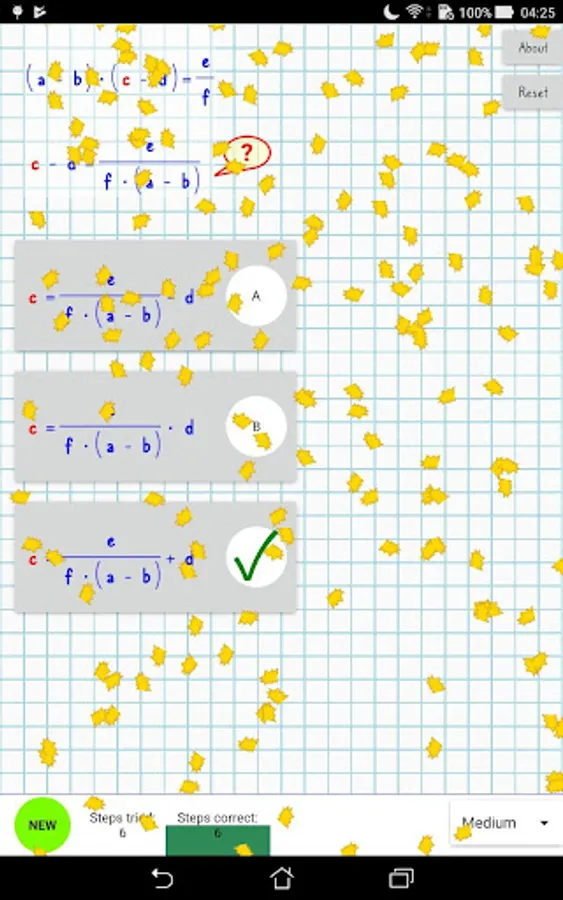 Each equation is resolved step by step. In the simplest category, this is usually only one step, but in higher levels of difficulty it can be quite a few. Every right step gives you points and every equation will be solved in the end.