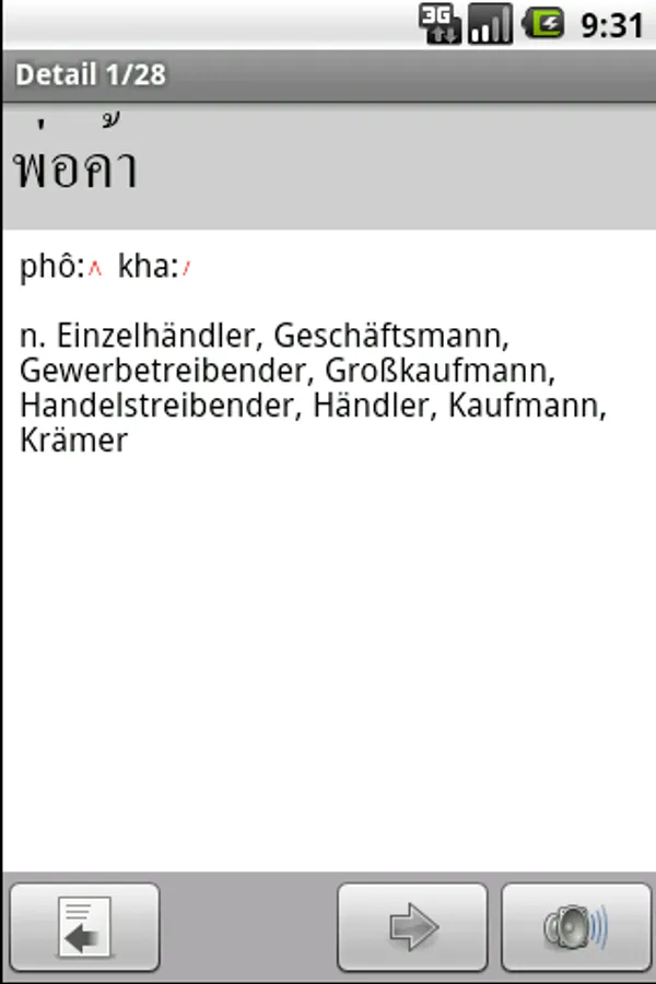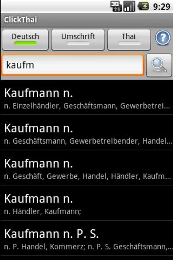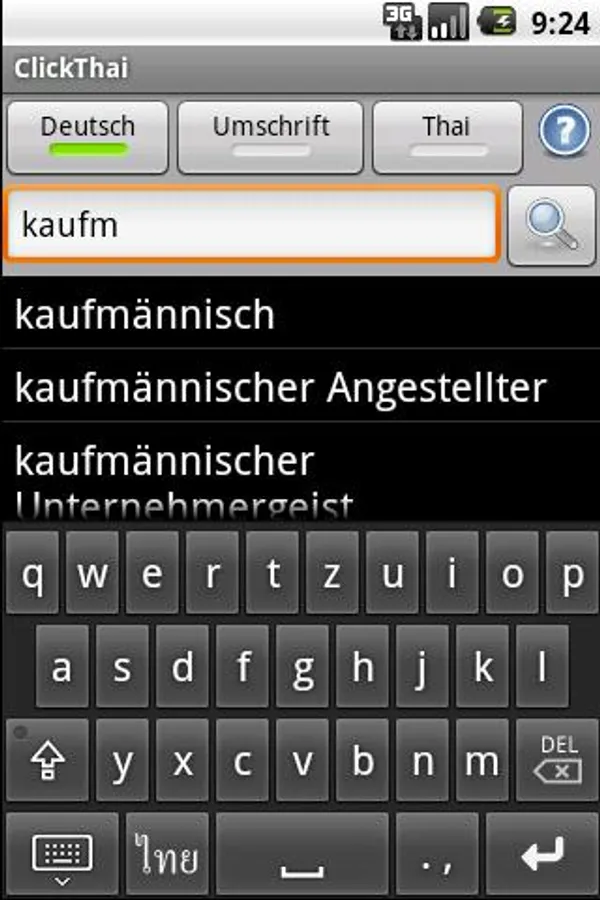 An input support for all search directions ensures that the search word must not even be fully entered. From the third entered character, all the words that match the incomplete search word. As soon as the requested word is, it only needs to be touched to immediately display the translation result. This is a great help especially for Thai words.