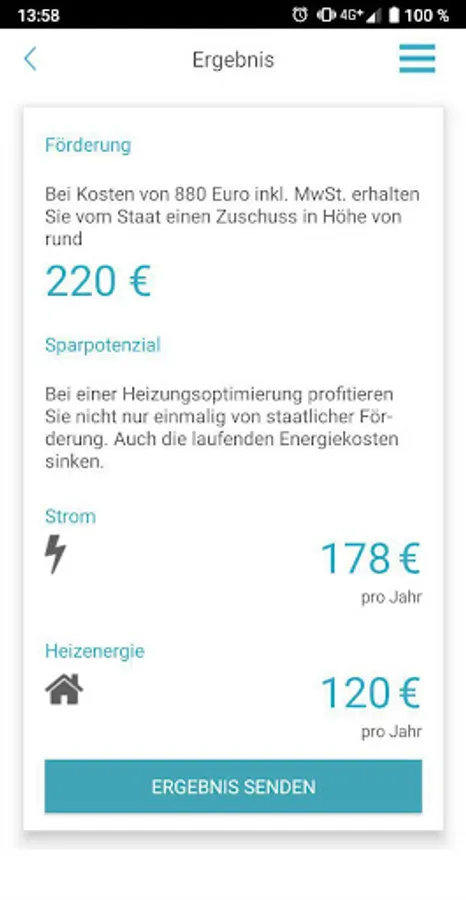 After selecting the type of building and measures and entering the estimated costs, the state funding is calculated - and the average savings potential for electricity, heating energy (if applicable).