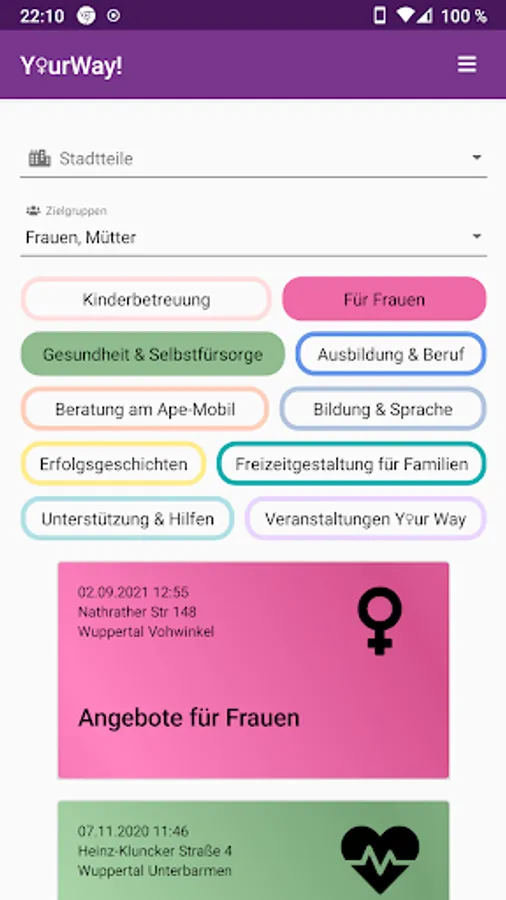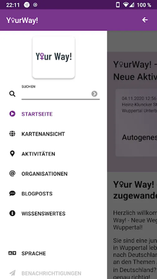 The YourWay! App is part of the "Y♀ur Way! - New Paths for Immigrant Women in Wuppertal" project, which is aimed specifically at young, immigrant women in Wuppertal. The YourWay! App provides information on events relating to the project and on the topics of work, family, leisure, culture and social issues in Wuppertal. Together we will find an offer in Wuppertal that suits you and we look forward to getting to know you and implementing new ideas together with you!