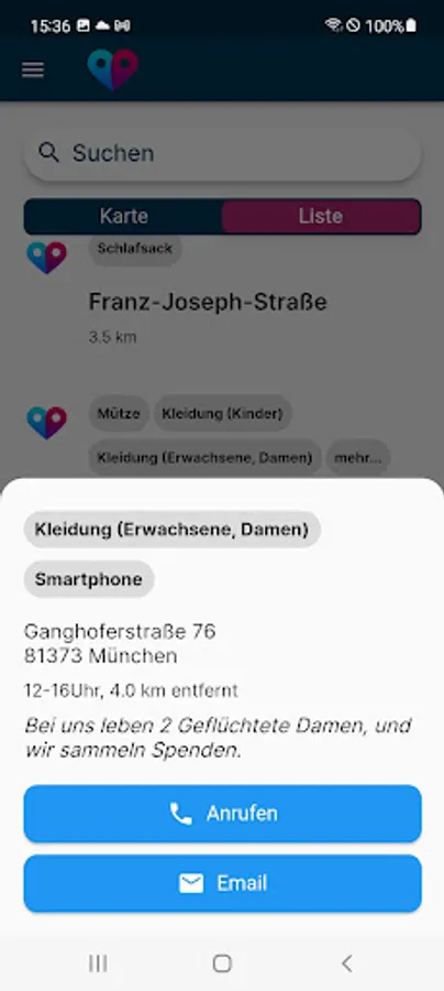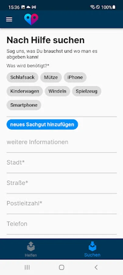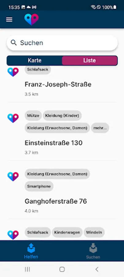 When you start the app, you can see the locations for donations in kind in the area and what is currently needed there. Organizations, but also private individuals who have taken in refugees, can enter what they need on a daily basis.