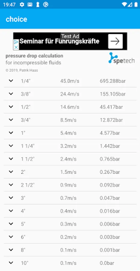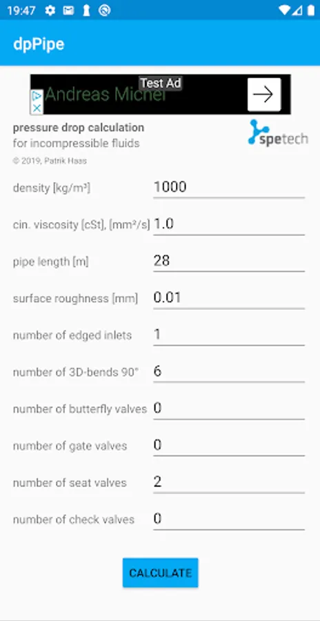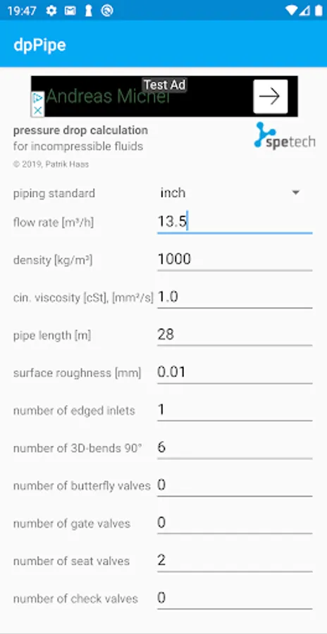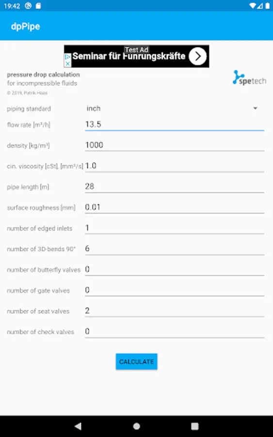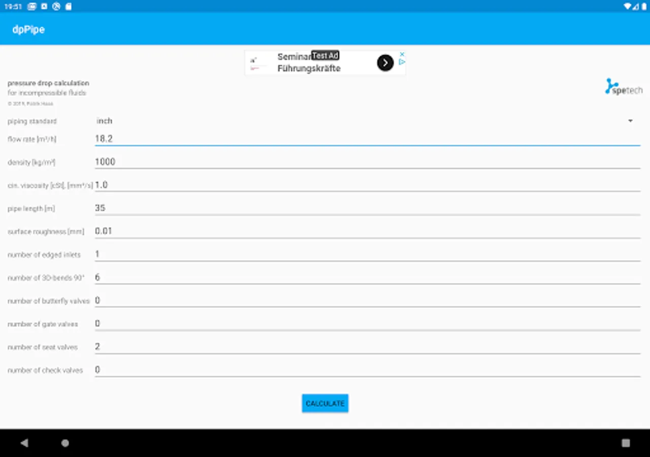 Pressure drop calculator for piping and armatures. This easy to use app is helpful to design piping systems and also to define pressure head of pumps.