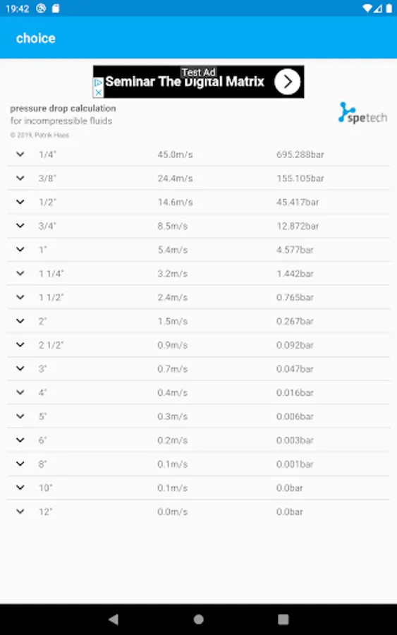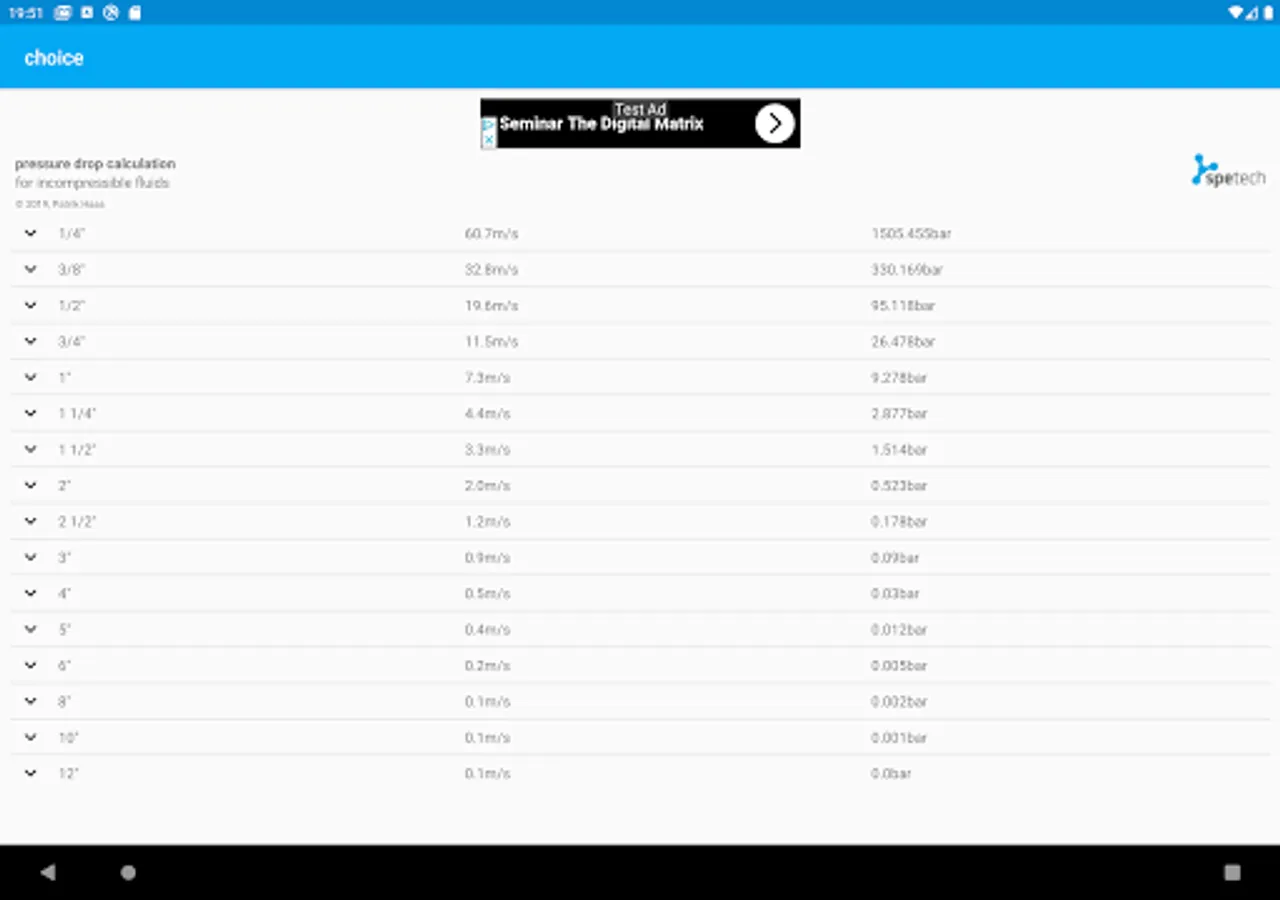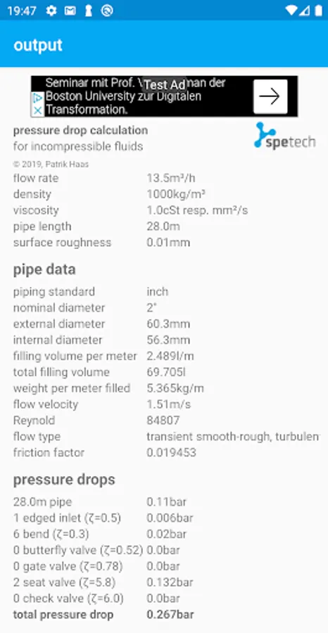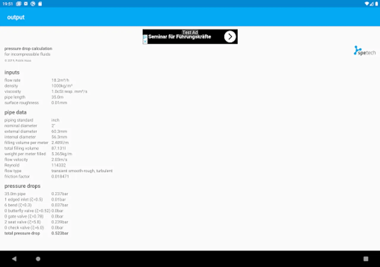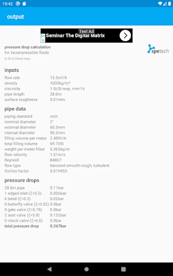 In addition to the pressure drop calculation, the app also calculates the volume and weight per meter of the pipe. Many more useful parameters are calculated.