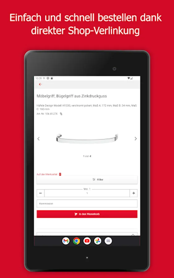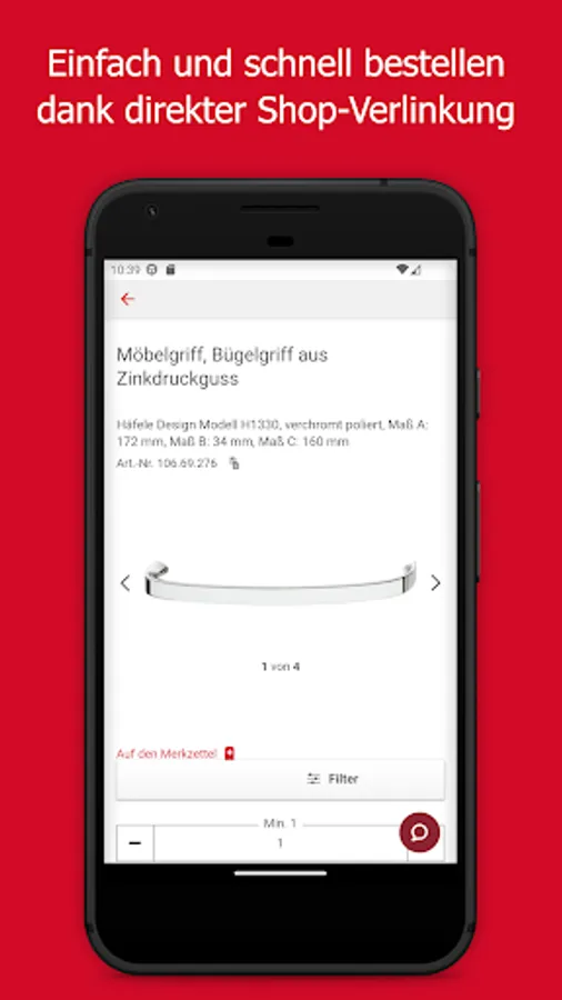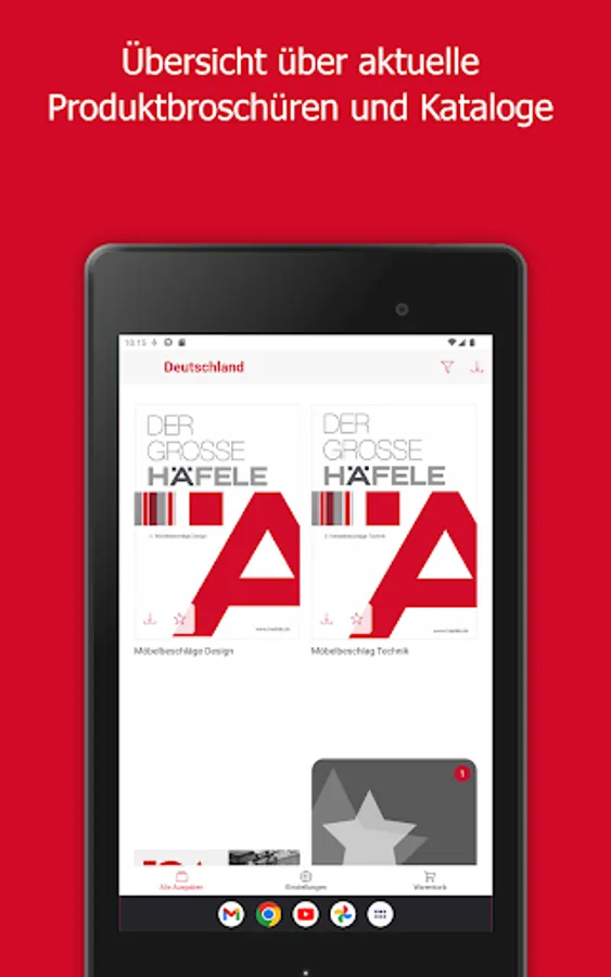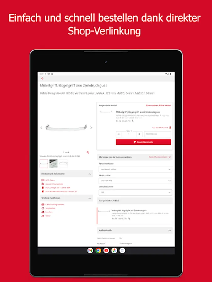 The Häfele app brings all fittings from the Häfele catalogs to your Android mobile device. Free to browse and order. All important catalogs such as the large Häfele furniture fittings for furniture and construction fittings can be called up.