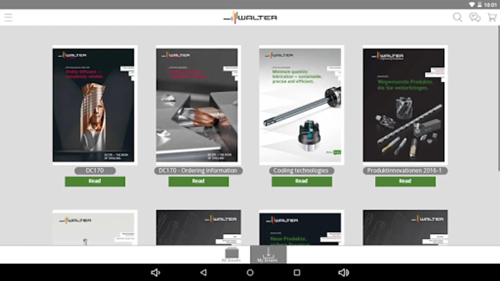 The Walter e-Library app provides fast, interactive access to the digital print media of the Walter AG worldwide: From the General Catalogue with over 49,000 products from the Walter, Walter Titex and Walter Prototyp competence brands, to Supplementary Catalogues and selected brochures – all available in 17 languages, wherever you are, whenever you need.