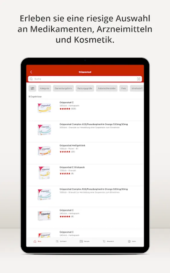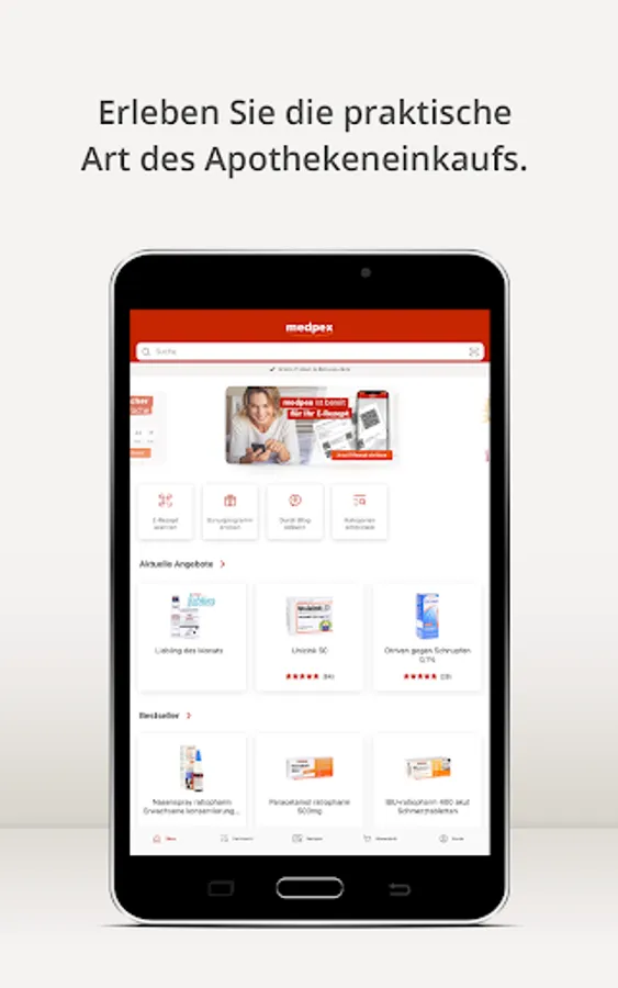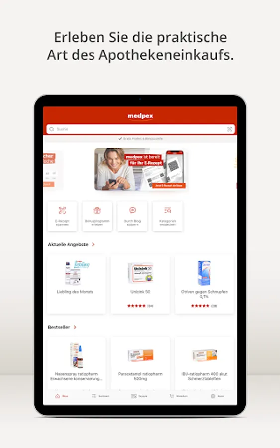 In the medpex app you will find current pharmacy bestsellers at a glance. With the help of the barcode scanner or the simple product search, you can use the app to do your pharmacy shopping quickly and easily with just a few clicks, even when youβre on the go, and have it conveniently delivered to your home.
