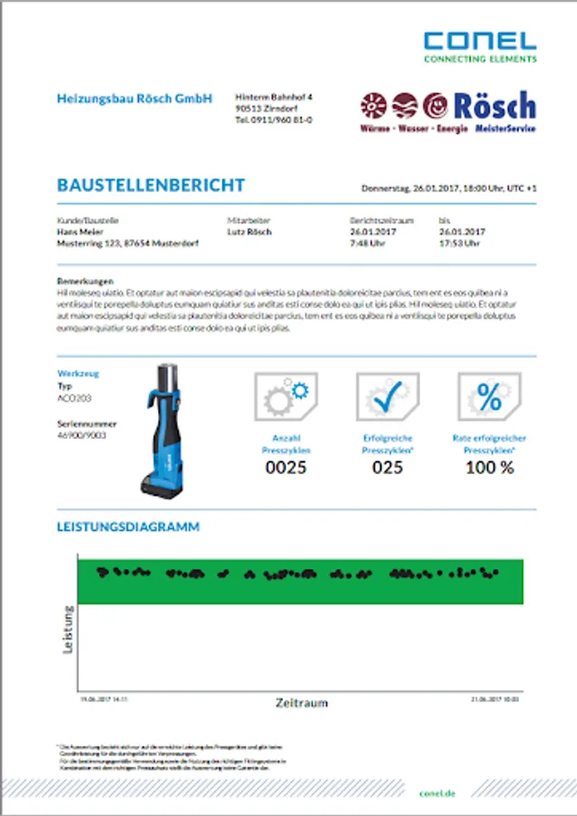 The ConelCheck App connects to the CONEL press machine PM2 via Bluetooth, so that device-related data can be retrieved and transferred to the app. With the ConelCheck App, the installer can check the device status automatically and thereby recognize whether the device is functioning properly. In addition, the logbook can be read out and the implemented report function can be used to document the executed cycles by generating a construction site report. This is stored in the app and can be retrieved at any time and sent by e-mail or printed out.