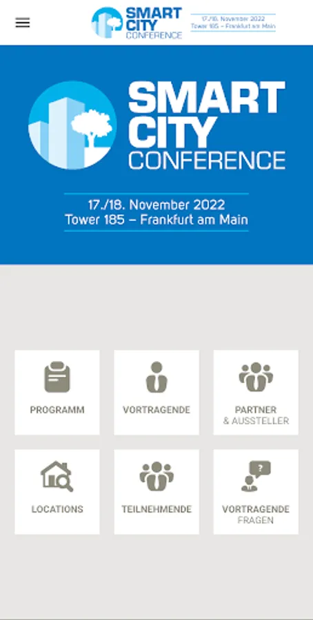 Event app with relevant information about the smart city conference. The congress will take place for the first time this year in Tower 185 in Frankfurt am Main.