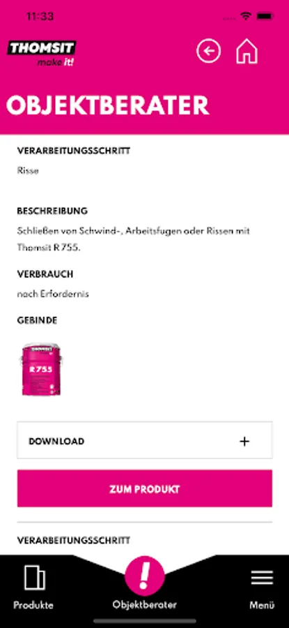 After a few clicks, the app provides the perfect recommendation for the floor project. Of course, including processing tips for the products and as a PDF for download. The best thing about it: The property advisor calculates the right product quantities from the input of the area and layer thickness.