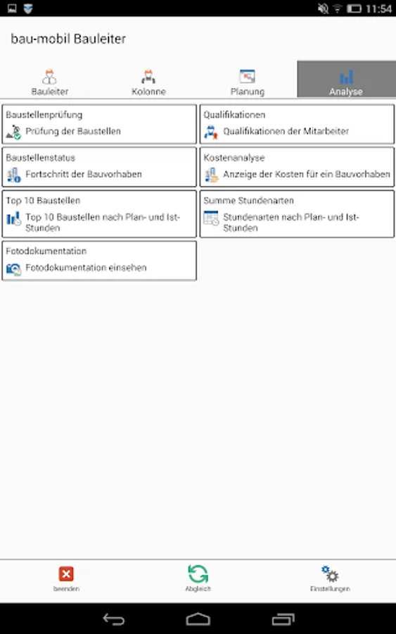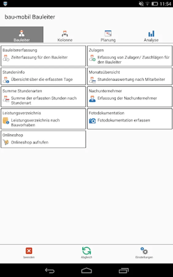 The construction-mobile app for the management of site manager and column costs, planning and analysis of staff and equipment ensures a comfortable and consistently reproducible working on site at the construction sites. All recorded information can be transferred directly into the construction-mobile workstation and back without detours.