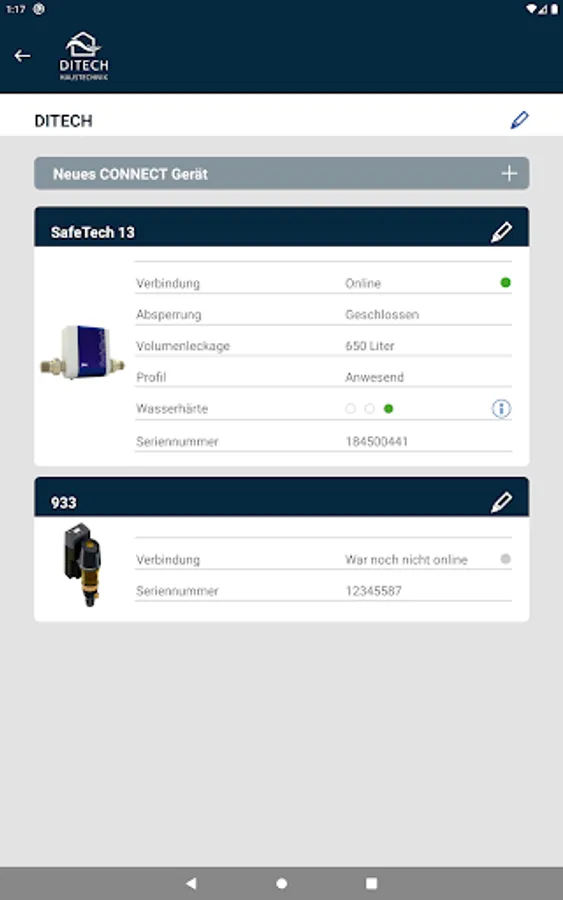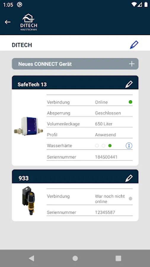 Sanitär-Union GmbH & Co. KG offers innovative home technology with its DITECH brand. The DITECH device world is open to you with our free app. One app for all DITECH devices, security for your house installation including vacation function. You can add new fittings, create projects and control everything online. The system is networked, all DITECH devices communicate and interact. The soft water system reports the leakage protection when it needs water for regeneration. You have everything in view: salt supply - input hardness - output hardness - water pressure - remaining capacity in liters - statistics such as water or salt consumption.