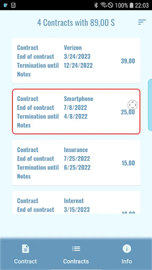 Flexible sorting options: Sort your contracts by last possible cancellation date, monthly fee, or contract name to find what you're looking for quickly and easily.