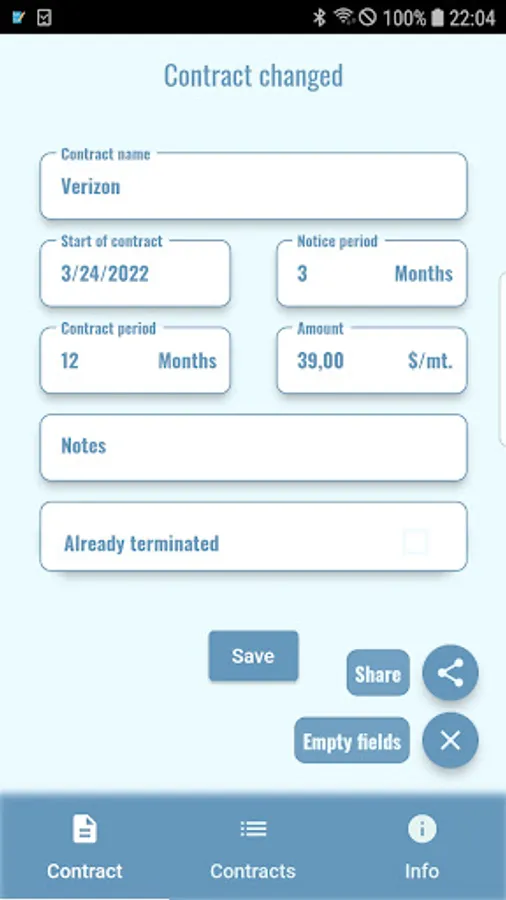 Local storage: All your contract data is stored locally on your device, so you can be sure it's safe and secure.