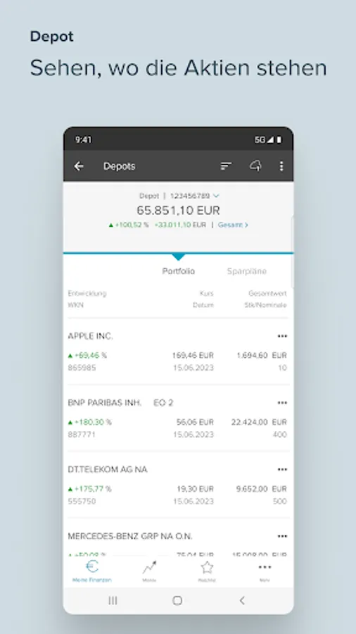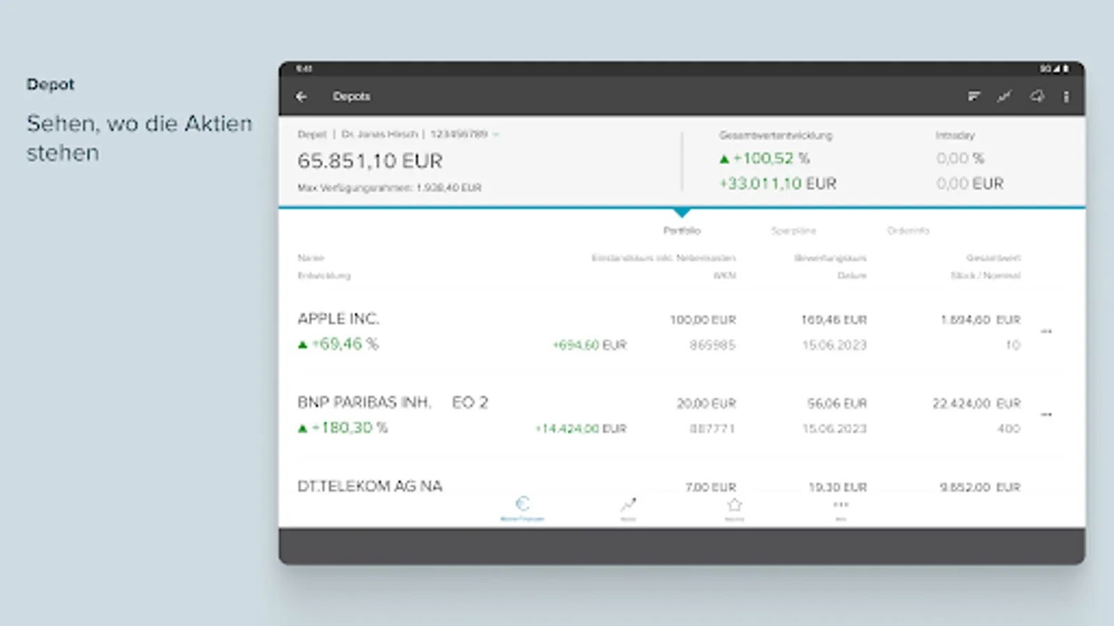 Open your current account or deposit directly in the app. Choose between the Essential checking account and the Unlimited checking account to suit your lifestyle. With your Consorsbank Depot you can trade stocks, ETFs and funds, no matter where. Set up savings plans as a long-term investment in an uncomplicated way and keep track of them at all times. Conveniently with your smartphone or tablet.