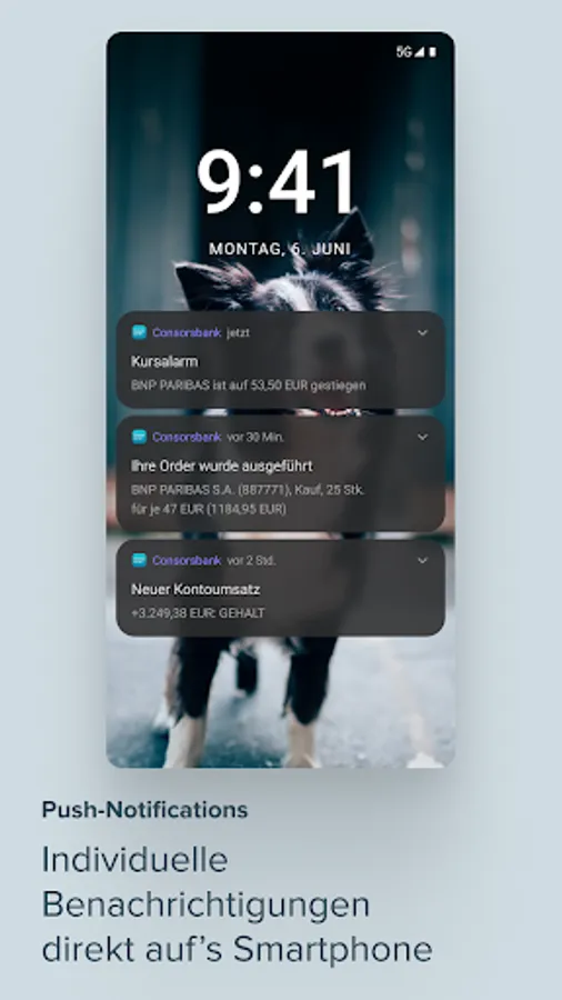 Whatever's happening in your account, you'll be the first to know with push notifications. Set your individual notifications. You will be informed in real time on your devices of incoming salary, account movements or sudden price fluctuations in your watch list.