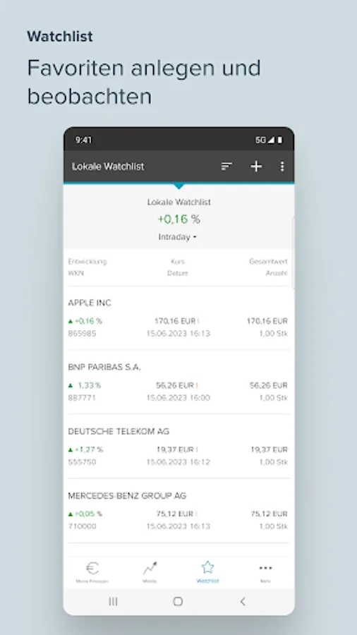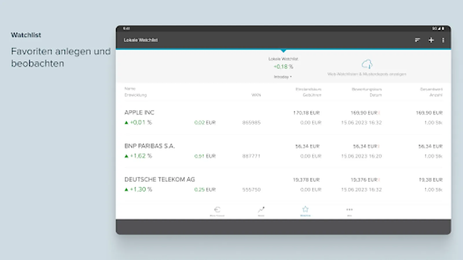 With your individual watchlists, you can keep an eye on all securities that are of particular interest to you. You can sync your watchlists with our website to use and edit them on all your other devices.