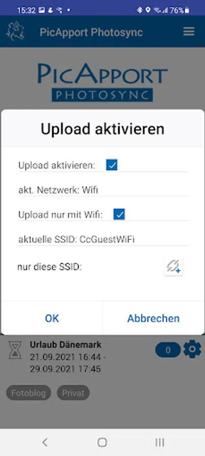 - Optional setting that the synchronization may only take place via WLAN. It is even possible to restrict it to a specific WLAN network (via SSID).