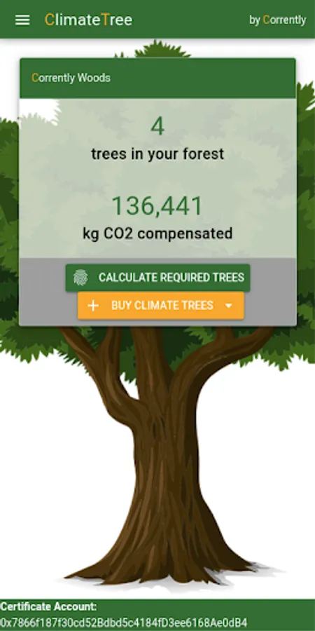 The Corrently Ecosystem supports your personal decarbonization. Using this app you could calculate your personal CO2 footprint and get trees to compensate. All trees have a VER Standard Gold Certificate and are fully settled using blockchain technology.