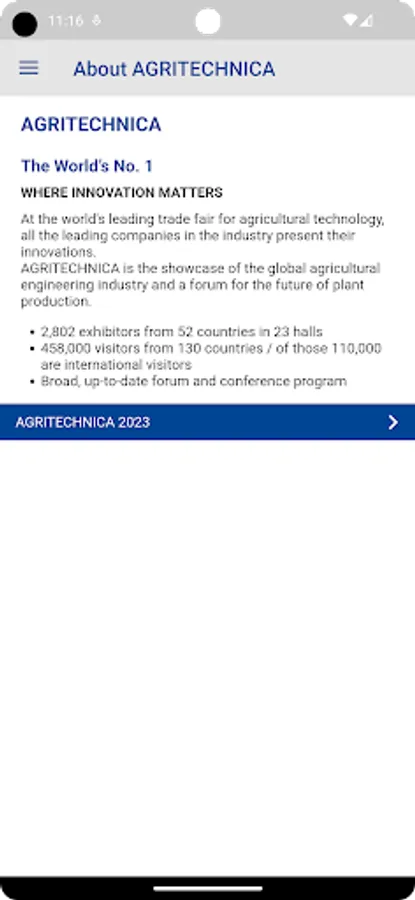 Plan your meetings at AGRITECHNICA. No matter whether you are scheduling your meetings with exhibitors or your participation in our technical program. This function gives you an optimal overview of all scheduled on-site activities by days, including a route display that always shows you the shortest route to your destination.