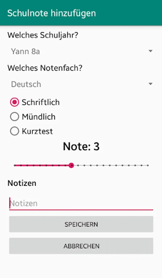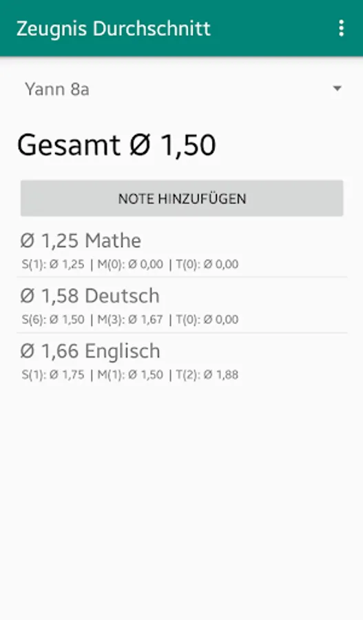 The APP makes it possible to record the respective school grades for several pupils / school years and any number of individually adjustable subjects. The average grade is calculated and displayed at any time. The previously set weighting of oral to written grades as well as the evaluation of the short test are taken into account in the calculation per subject and in the overall average.