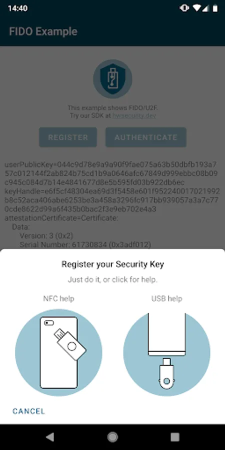 Our SDK provides a FIDO client for Android that works with Security Keys (FIDO authenticators), such as YubiKeys, over NFC and USB.
