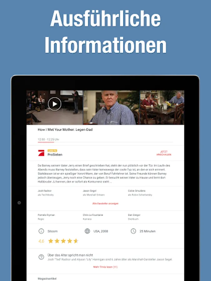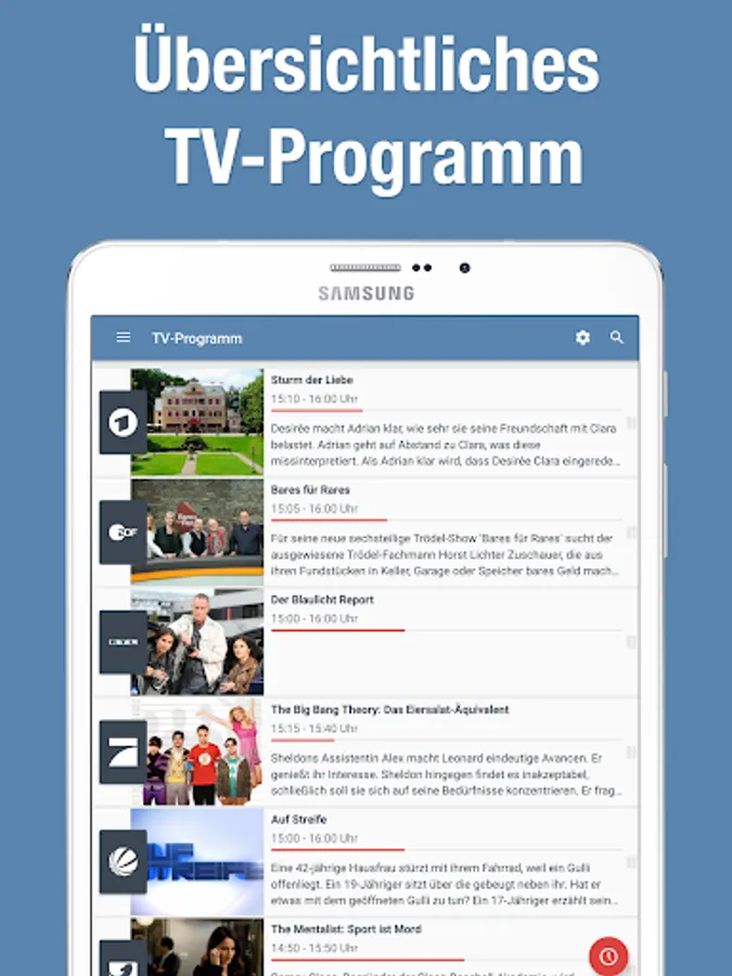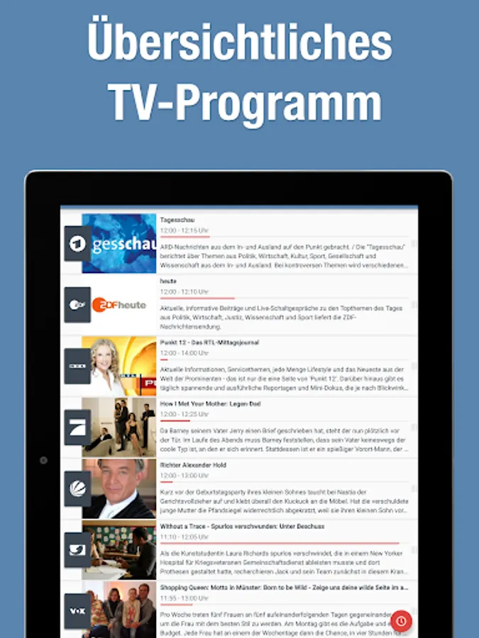 2 Broke Girls, Current Hour, Anne Will, On Patrol, The Bachelor, The Commissioner, Family Guy, Galileo, How I met your mother, In all friendship, Markus Lanz, maybrit illner, Nascar, Richter Alexander Hold, Rosenheim Cops, Rote Rosen, Sachsenspiegel, Scrubs, Simpsons, SOKO Leipzig, SOKO Vienna, sport in the east, sport in the west, storm of love, tough, news, crime scene, The Big Bang Theory, Two and a half men, among us, suspected cases