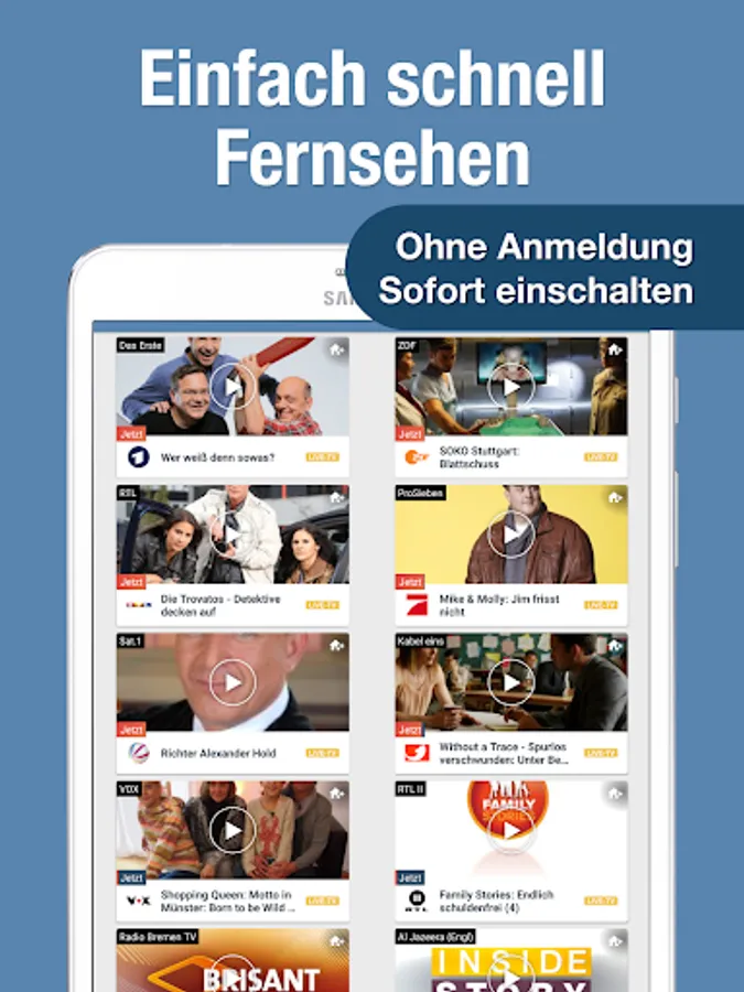 The television app is part of the TV.de app family with apps for live TV, football and media libraries. Simply test all apps for free and select your favorite apps! All settings and purchases can be transferred via login.