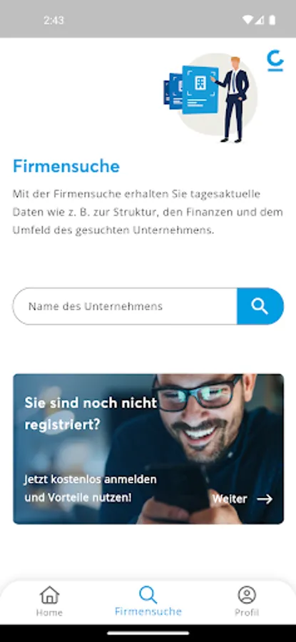 You are not yet a member of Creditreform? No problem! Get an initial impression of our data and service quality in the app, even as an anonymous or registered user. If you want something more, the next upgrade isn't far away: As a Creditreform member, you get premium access to all company reports, including credit ratings and many other online services!