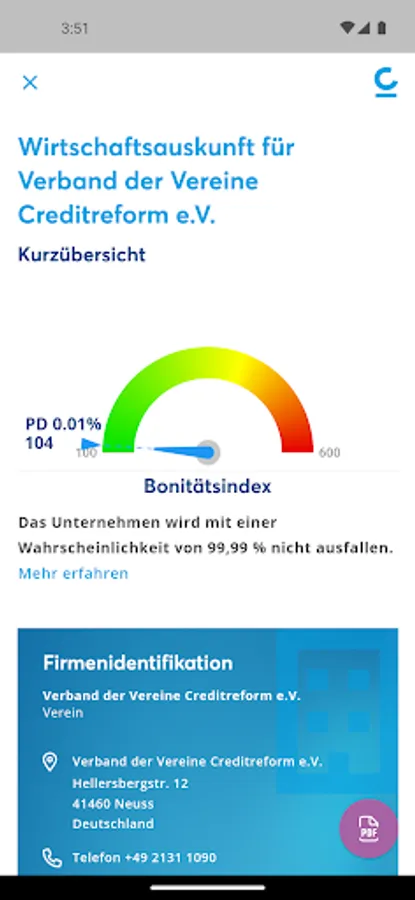 Do you know the creditworthiness of your business partners? Or would you rather be on the safe side? The Creditreform credit reports enable a quick assessment of the solvency of companies. The creditworthiness index can have a value from 100 to 600. The lower the creditworthiness index, the better the rating of the requested company. This can also be seen directly from the color scale of the creditworthiness index (green to red).