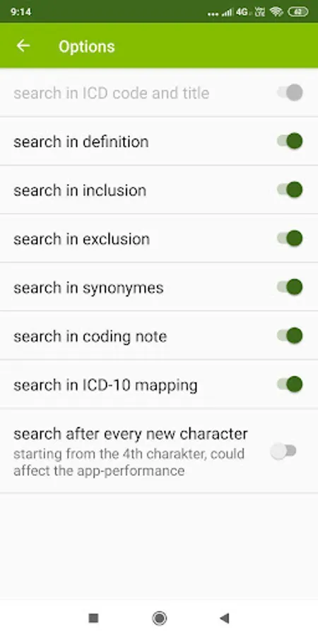d) Define yourself, where search should take place: include or exclude synonymes, definitions, in-/exclusions, coding-notes or ICD-10-codes in/from the search.