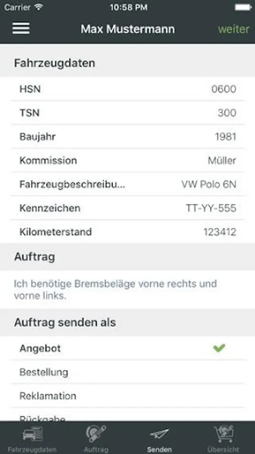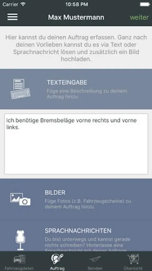 For customer orders the vehicle data, texts, pictures or voice messages can be recorded.