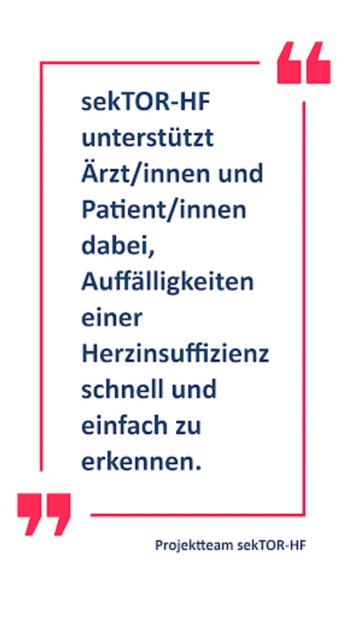 The care concept of sekTOR-HF and the associated app are based on current scientific knowledge and guidelines for telemedical patient care. We pay attention to the highest possible usability. We regularly test the technical components and continuously optimize our systems and the operating concept. The prerequisites for using the app are a) that an initial adequate diagnosis has been carried out by a specialist for the participating patients and b) that they only use this app with the access data provided to you as part of the sekTOR-HF innovation fund project. Further information on the project and the conditions of participation can be found at www.sektor-hf.de.