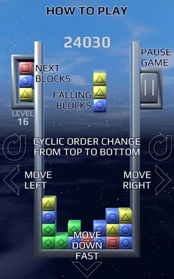 Move the falling stones into the right column and try to match at least 3 similar blocks in every direction (horizontal, vertical and diagonal). During falling you can change the order cyclic from top to bottom.