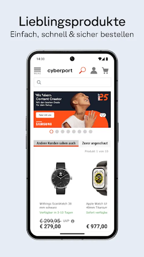 Thanks to the perfect combination of security and convenience, our app impresses with login via fingerprint or face scan and the option of automatic login. So you are always logged in and can buy your gadgets, mobile phones and laptops even faster and more securely or manage your customer account. Of course, you can deactivate this function at any time in the settings of the Cyberport app.