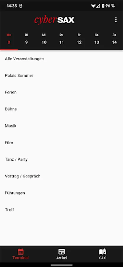 The cyberSAX terminal is a comprehensive and conveniently available event calendar for the Dresden region, which offers information on an average of 500 event dates per day.