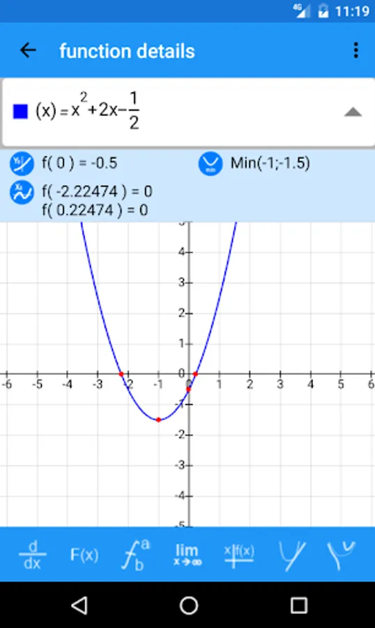 In a few seconds you derivate or integrate your desired function, calculate the zero points of your function und show them in the function plot. See all maxima, minima or inflection points in one view.