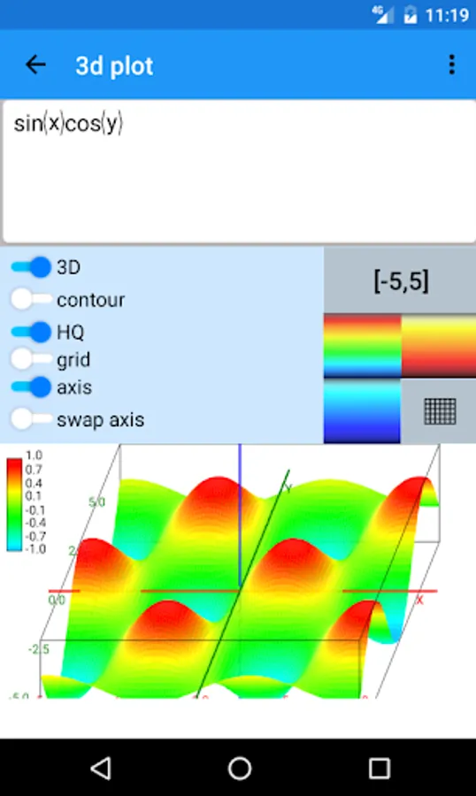 Calculate any formula you want and show them in a 2d or 3d plot. The natural display shows fractions, roots and exponents as you would expect it from mathematics.