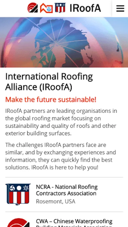 The IRoofA - International Roofing Alliance - is an association of the ZVDH, NRCA and CWA as the leading professional associations of the roofing industry in their economic area. Together they represent the technical and economic standards, developments and trends of the roofing industry through their expertise.