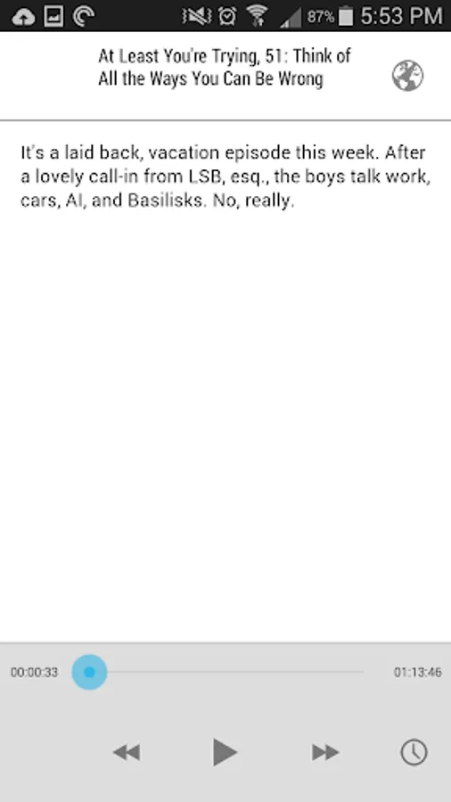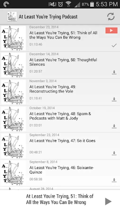 This app is an easy way to become a listener of the At Least You're Trying Podcast, http://gtradio.net/alyt. Once the app is installed, you're able to download and listen to any episode. The episode listing will update as new episodes are (sporadically) released.
