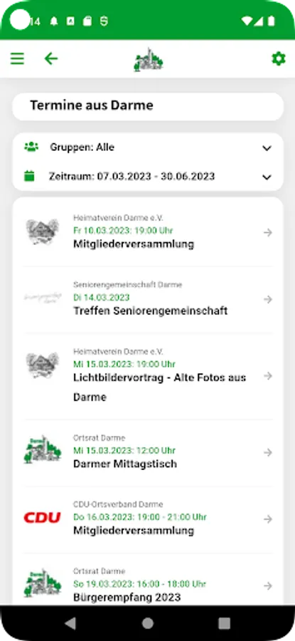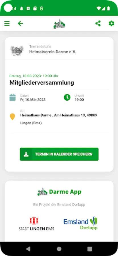 The "Darme App" is the useful app for all residents of the district of Darme in Lingen in Emsland. With the app you are always up to date on what is happening in Darme: The app informs you about the latest news, dates and events of the local clubs and associations. Each club can introduce itself in the app with profile data, picture galleries and contact details, so you can quickly and easily find the information you are looking for.