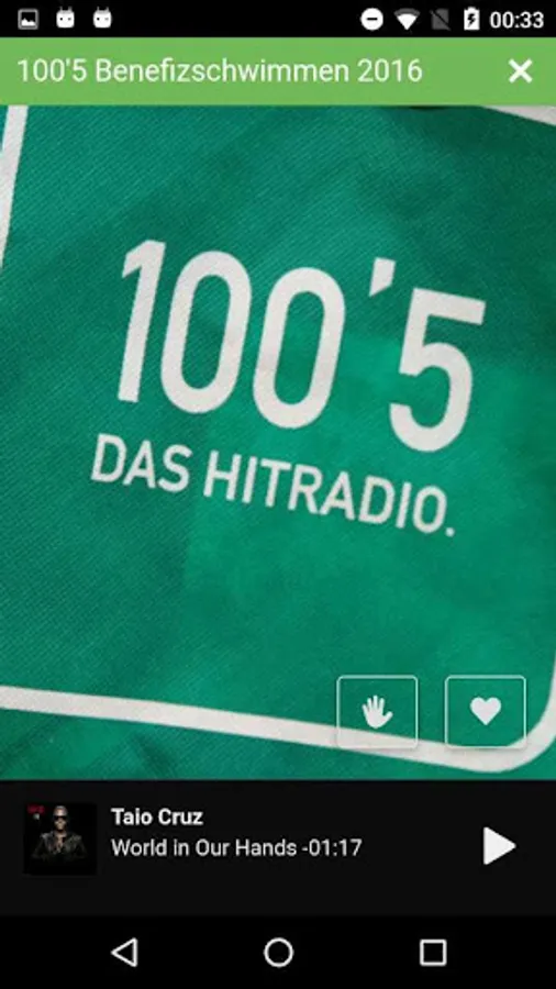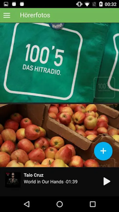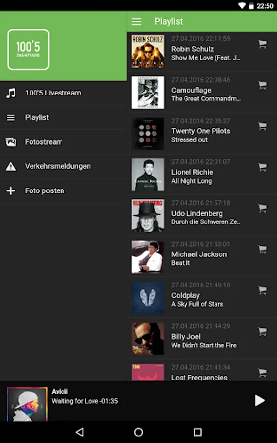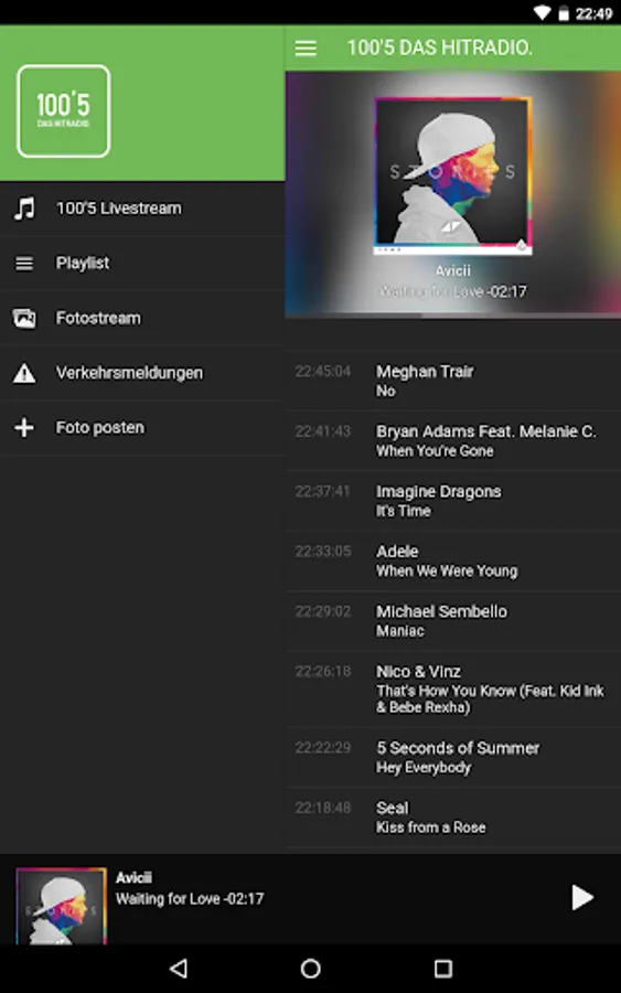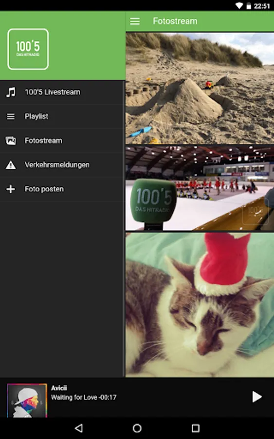 Use the menu in the upper left corner you can navigate through the different sections of the app: 100'5 LiveStream, playlist, traffic reports, and Photo Stream Photo Send. The menu can also be opened by the Sliden from left to right or from right to left closed.