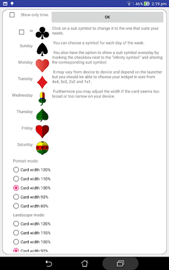 - The width of the widget can be resized to smaller 80%, 90% and wider 110% and 120%. This can be done independently for landscape and portrait mode. This size adjustment maybe necessary if on your device the card form seems too narrow or too broad.