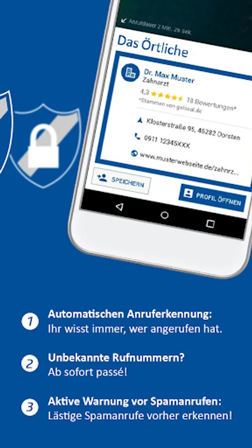 The Das Örtliche Android app identifies unknown phone calls and warns you from phone spam like telemarketing calls or phone fraud. When a number unknown to you tries to reach you, the Das Örtliche Android app not only warns you against spam callers. If it cannot find the number in its spam database, it searches in the huge phone number directory database of Das Örtliche to identify the caller. This way, the app not only protects and informs you, it gives you back an easy mind when you answer a call.