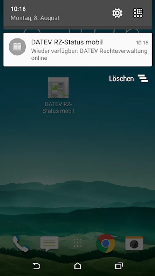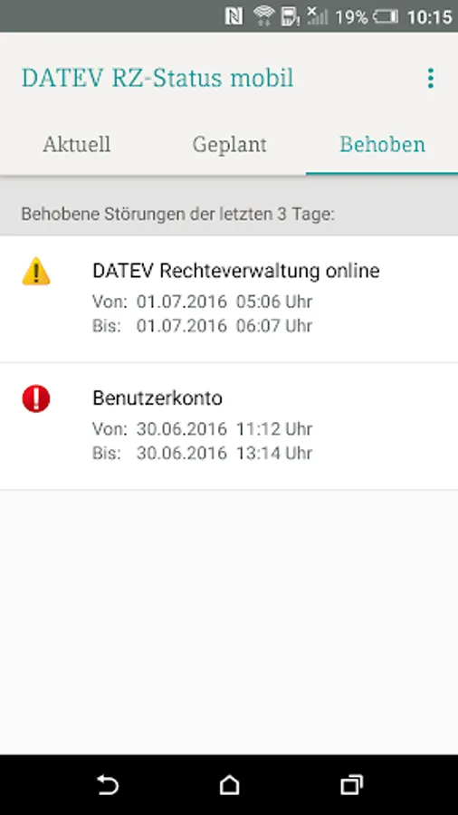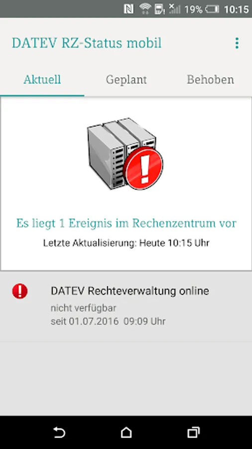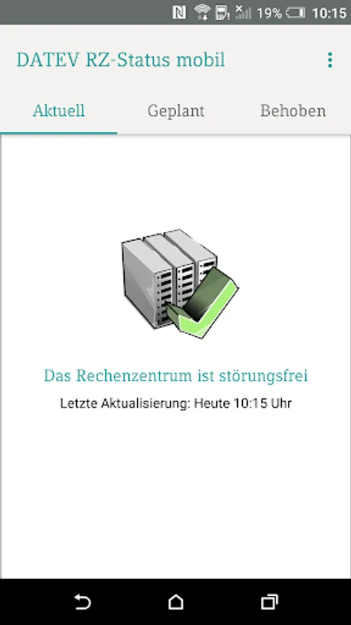 The app DATEV RZ Status mobile receives push notifications and informed so on maintenance, malfunction or failure in the DATEV computer center. In this way you they are made active around the clock and regardless of DATEV service hours. The app allows access to the current data center status anytime, anywhere mobile, regardless of computer or landline.