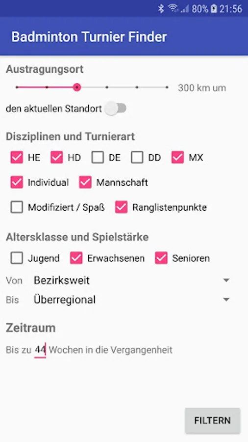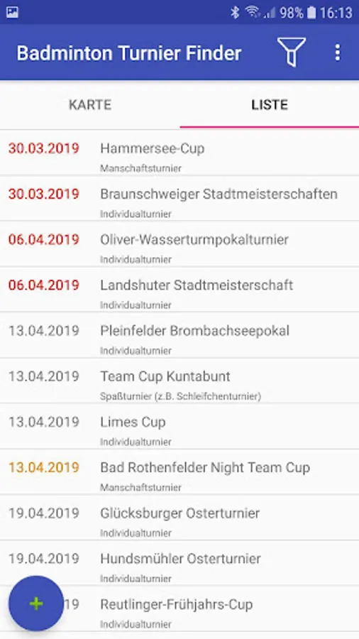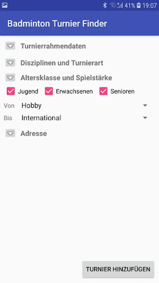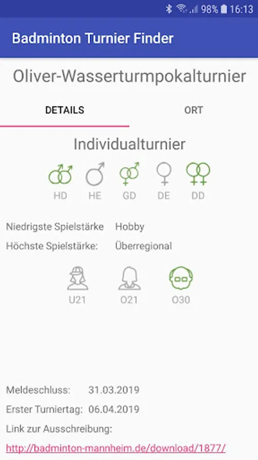 - Filter tournaments by distance, time, tournament type, age group, skill level, ...