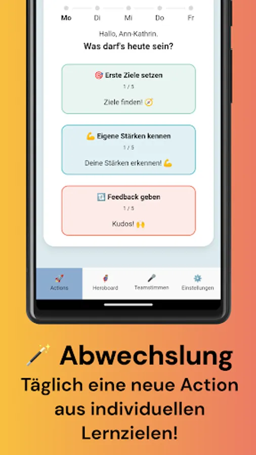 In order to guarantee fun while learning and to keep the long-term motivation in the team high, we rely on proven gamification elements: The team can play a joint team event and monitor their own learning progress. In addition, the “Heroboard” shows the total of actions completed by the (pseudonymized) team members and “Action Streaks” - if a participant has completed actions for several days in a row.