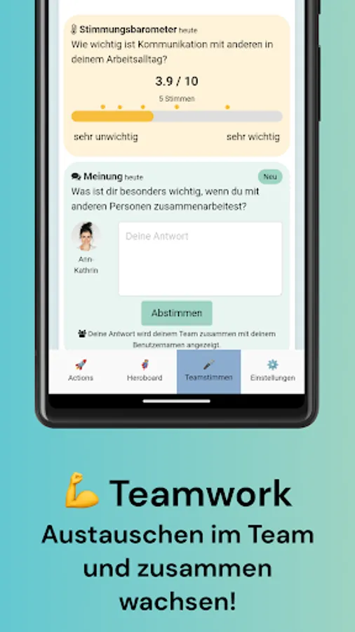 The team area gives the participants the opportunity to exchange information on certain questions and problems, to share the current mood in the team and to take part in votes. This is how the team grows together and creates space for social learning.